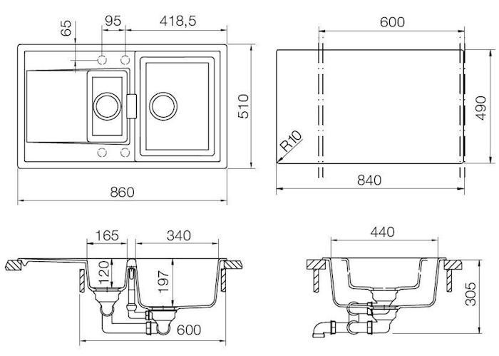 Отводная арматура с клапаном-автоматом 3 1/2'' и переливом, сифон с возможностью подключения посудомоечной или стиральной машины.