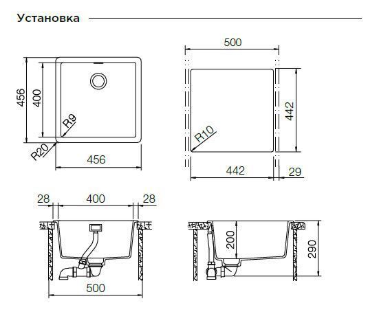 Отводная арматура с клапаном-автоматом и переливом, сифон с возможностью подключения посудомоечной или стиральной машины.