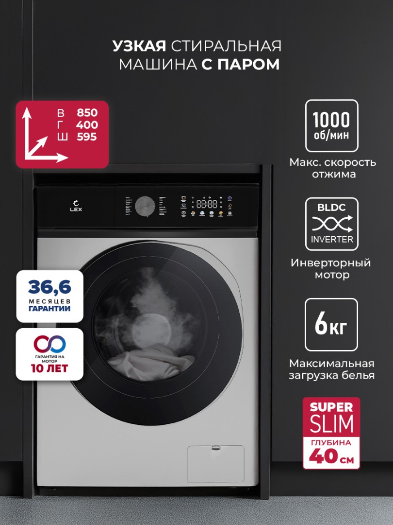 Стиральная машина LEX Slim — это качество на долгие годы, а увеличенная гарантия 36,6 месяцев — это лишнее тому подтверждение!