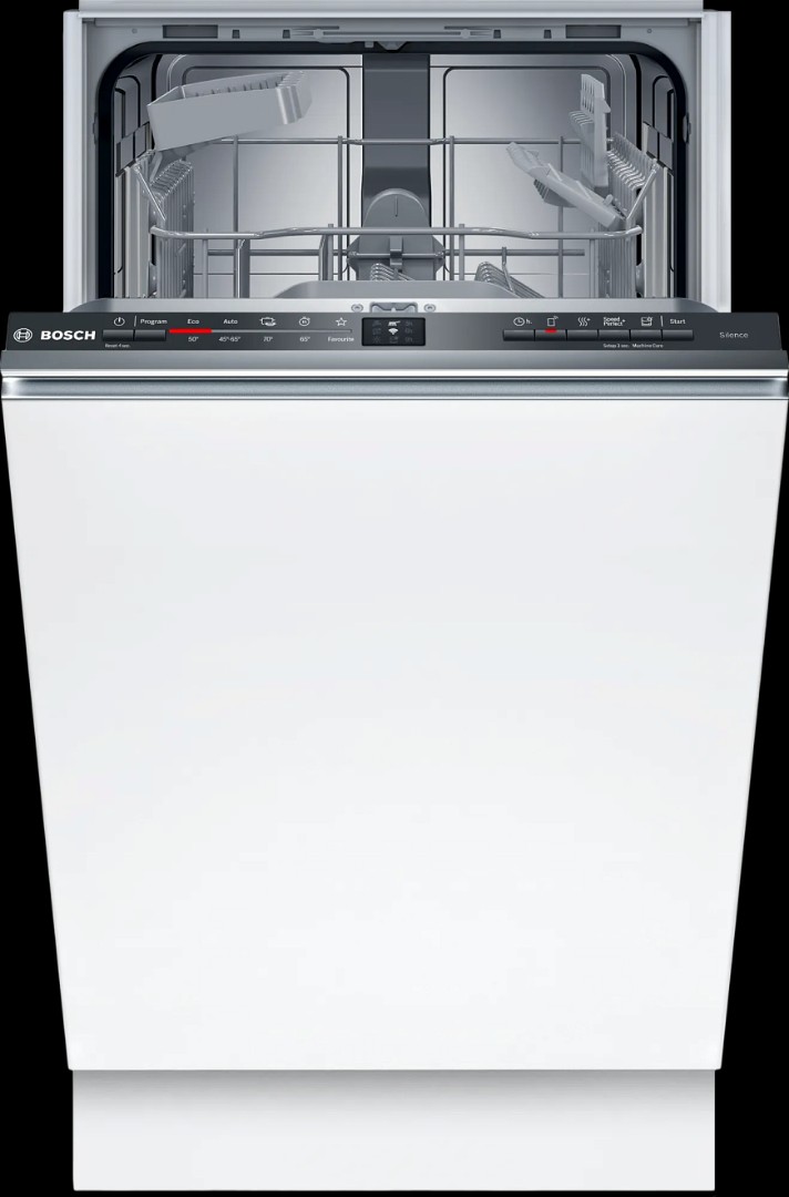 Встраиваемая посудомоечная машина BOSCH SPV2HKX42E, черная — узкая модель габаритами 44,8x55x81,5 см, которая вмещает до 9 комплектов посуды. В этой модели электронное кнопочное управление, все параметры работы наглядно отображены на панели пиктограммами, активные установки отображают светодиодные индикаторы. Предусмотрен и индикатор InfoLight — луч на полу, который погаснет, когда цикл завершится.