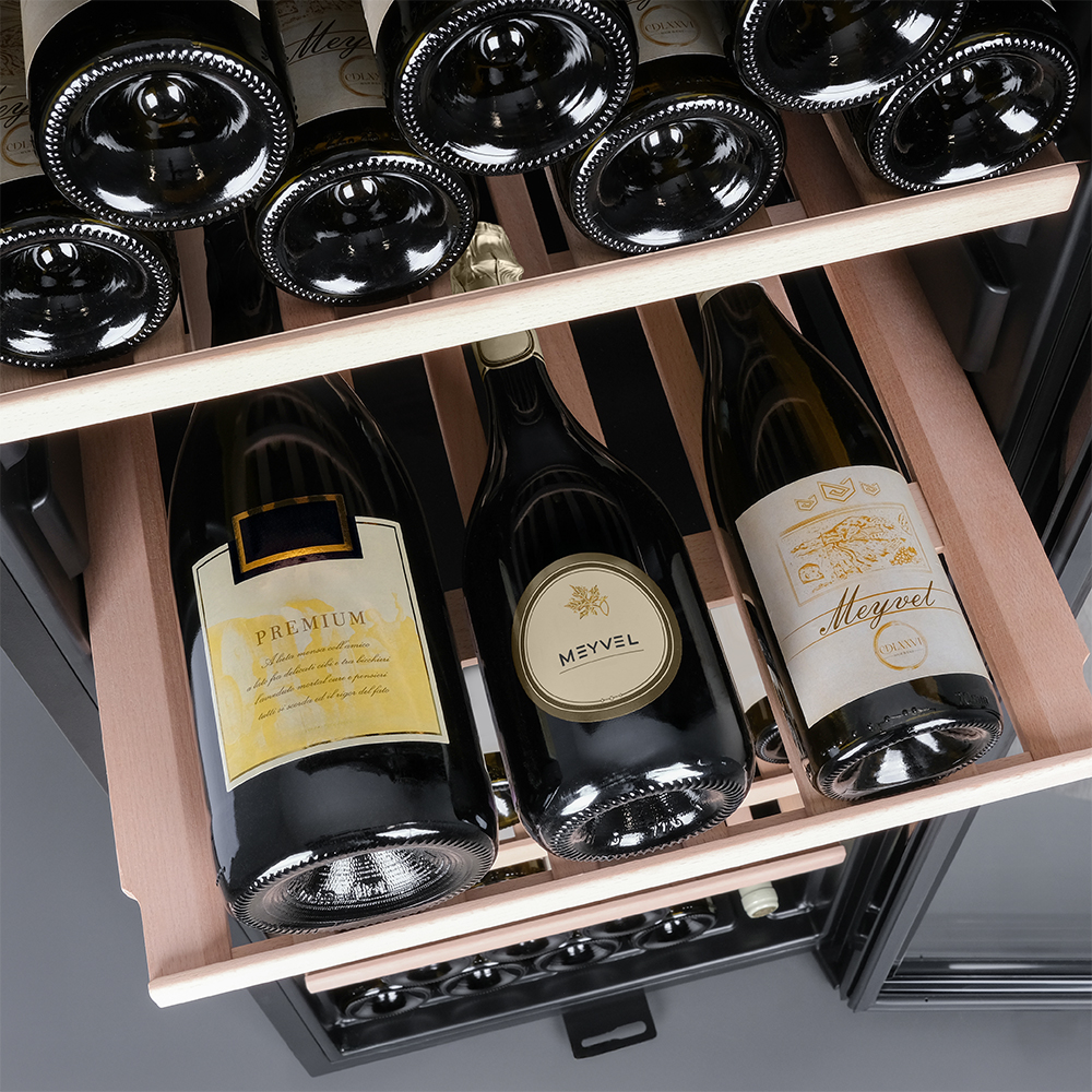 Управление осуществляется через сенсорную панель, а настройка интуитивно понятна. Также предусмотрены важные функции для защиты винотеки: замок на двери для безопасности, угольный фильтр, который очищает воздух внутри шкафа от посторонних запахов, сигнализация отклонения температуры, которая предупреждает о любых изменениях в условиях хранения, и блокировка панели управления, предотвращающая случайные изменения настроек.
