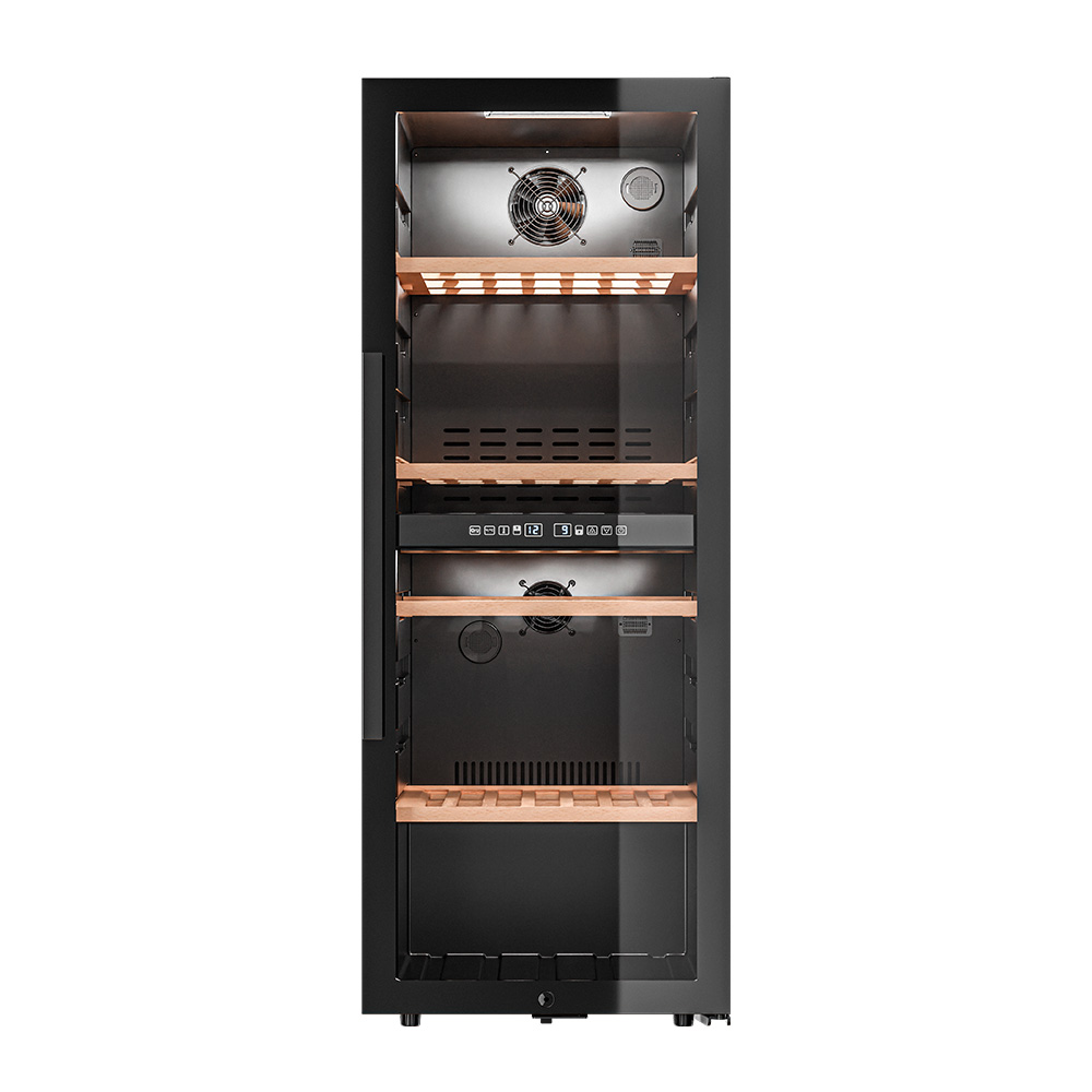 Модель оснащена четырьмя полками из дерева, что не только выглядит стильно, но и способствует правильной циркуляции воздуха внутри шкафа. Дополнительно можно установить до 5 полок, а также приобрести демонстрационную полку и полку для фужеров. Двойное стекло с УФ-фильтром надежно защищает вино от вредного воздействия света, что сохраняет его уникальный вкус и аромат.