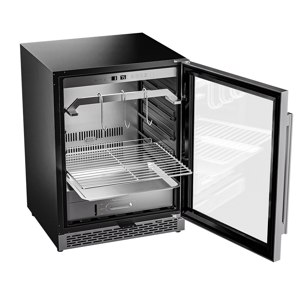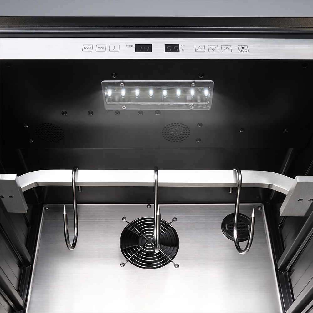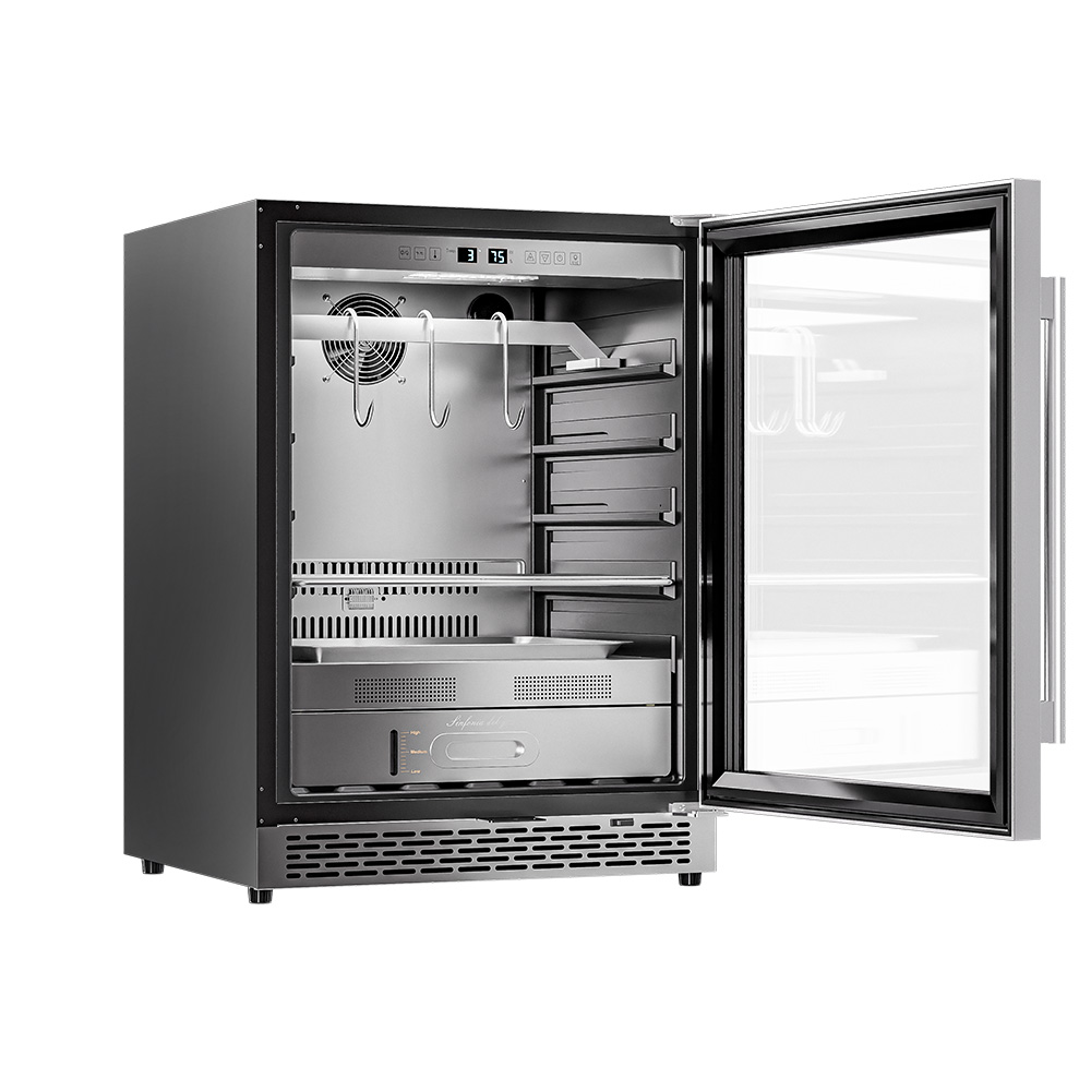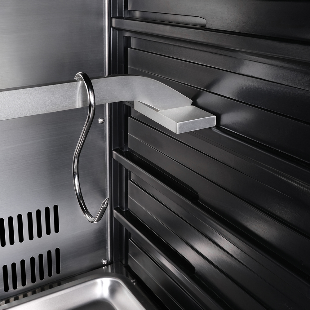 Внутреннее оснащение холодильника продумано до мелочей. Регулируемые ножки позволяют выровнять устройство, а встроенные крюки, поднос для соли и решетка из нержавеющей стали облегчают размещение и сушку содержимого. Резервуар для воды дает возможность контролировать уровень влажности в диапазоне от 60 до 85%, что важно для равномерного вызревания.
