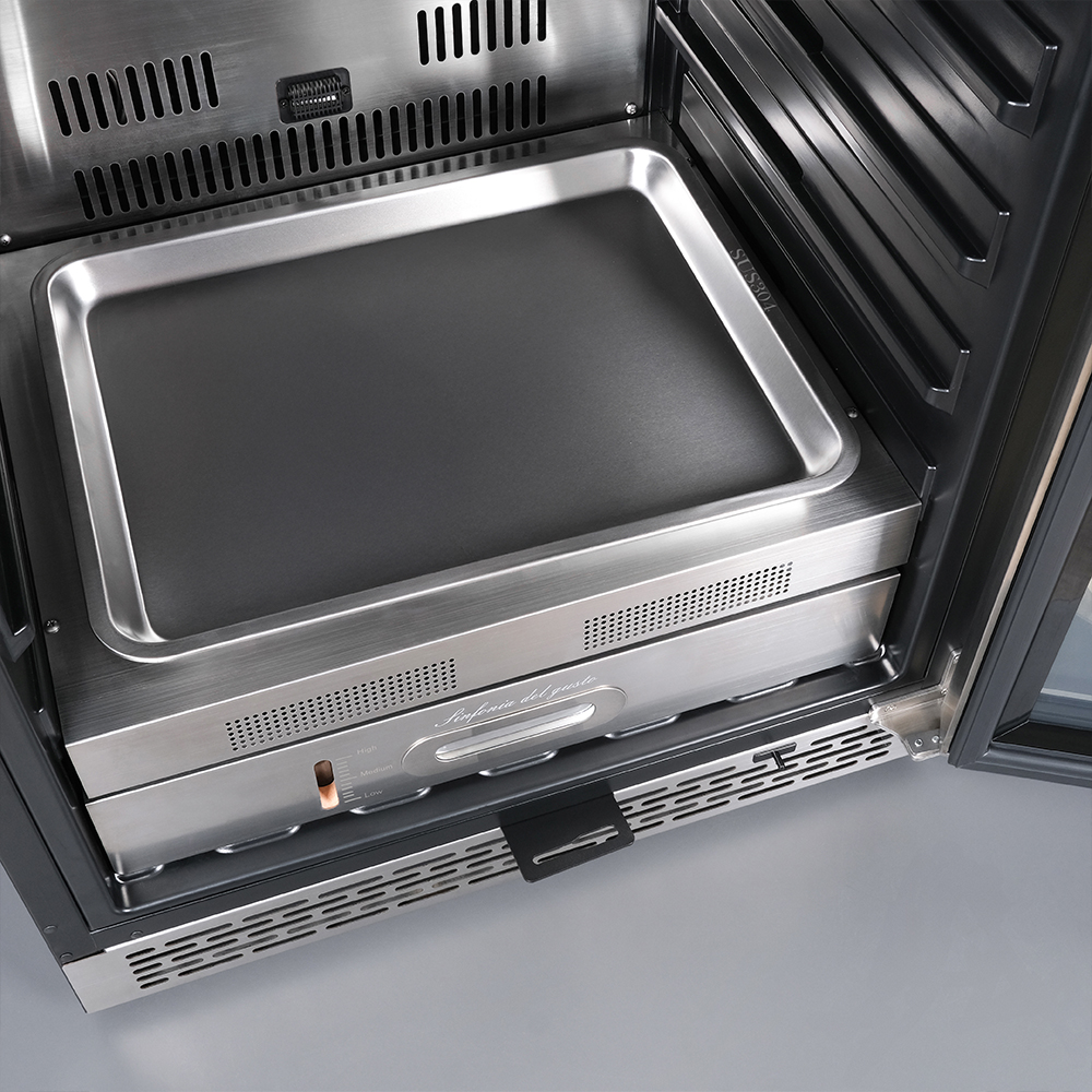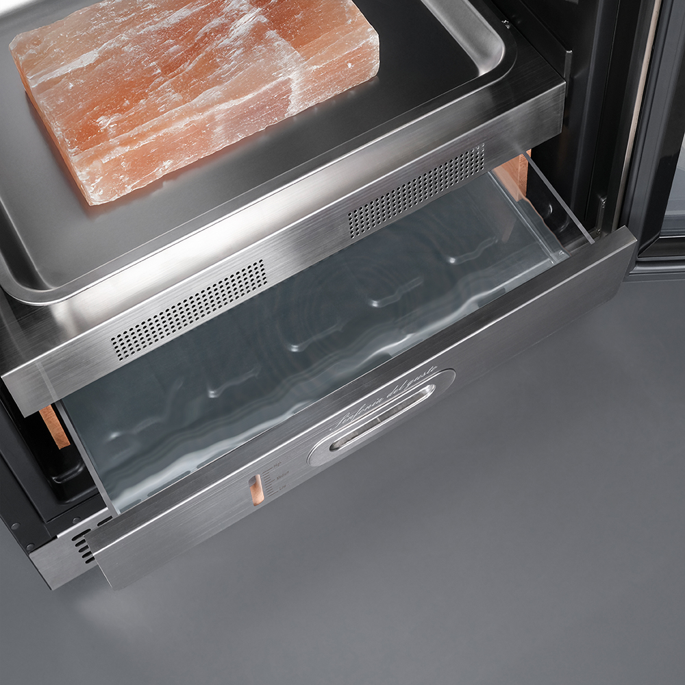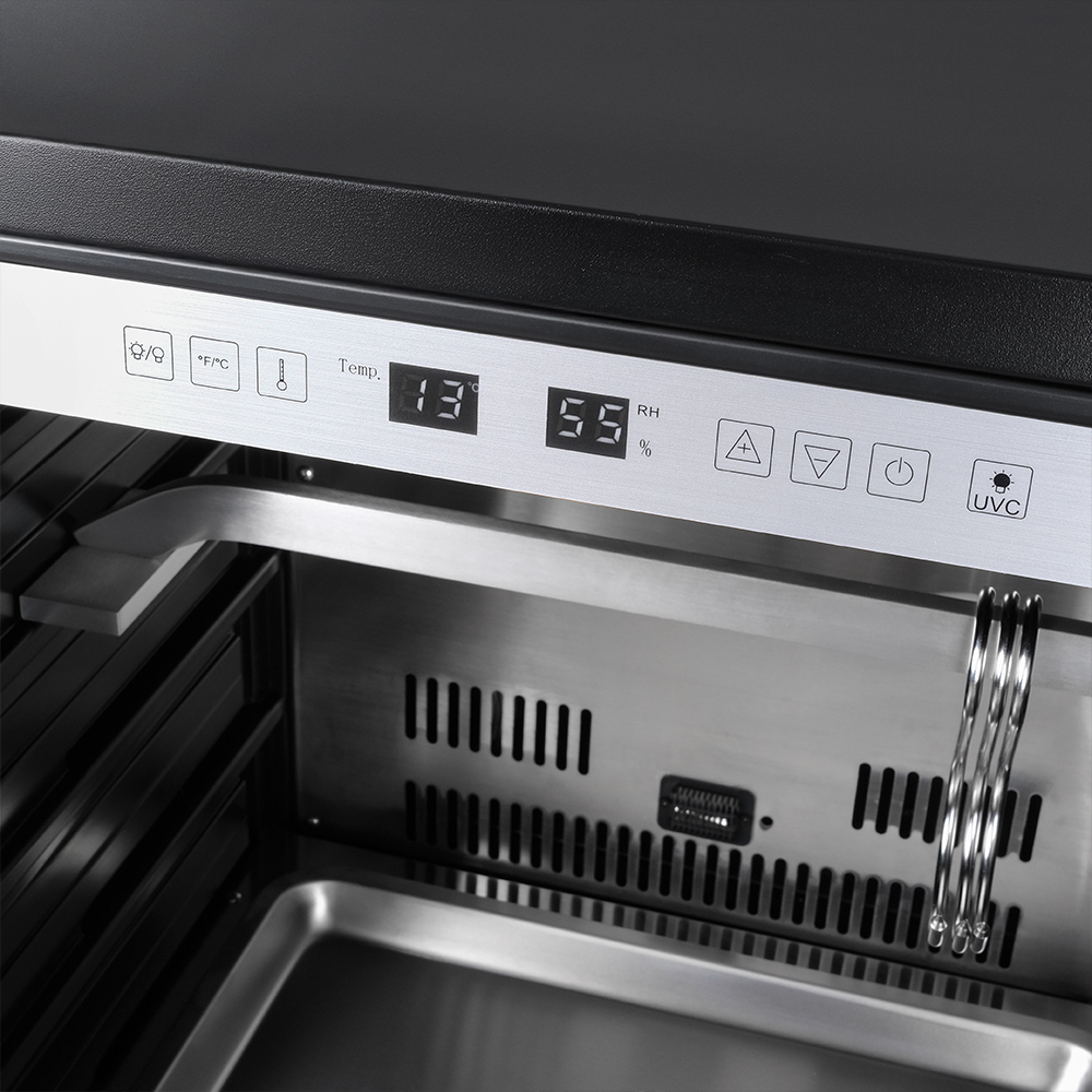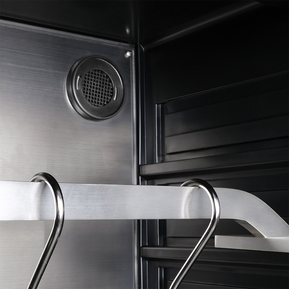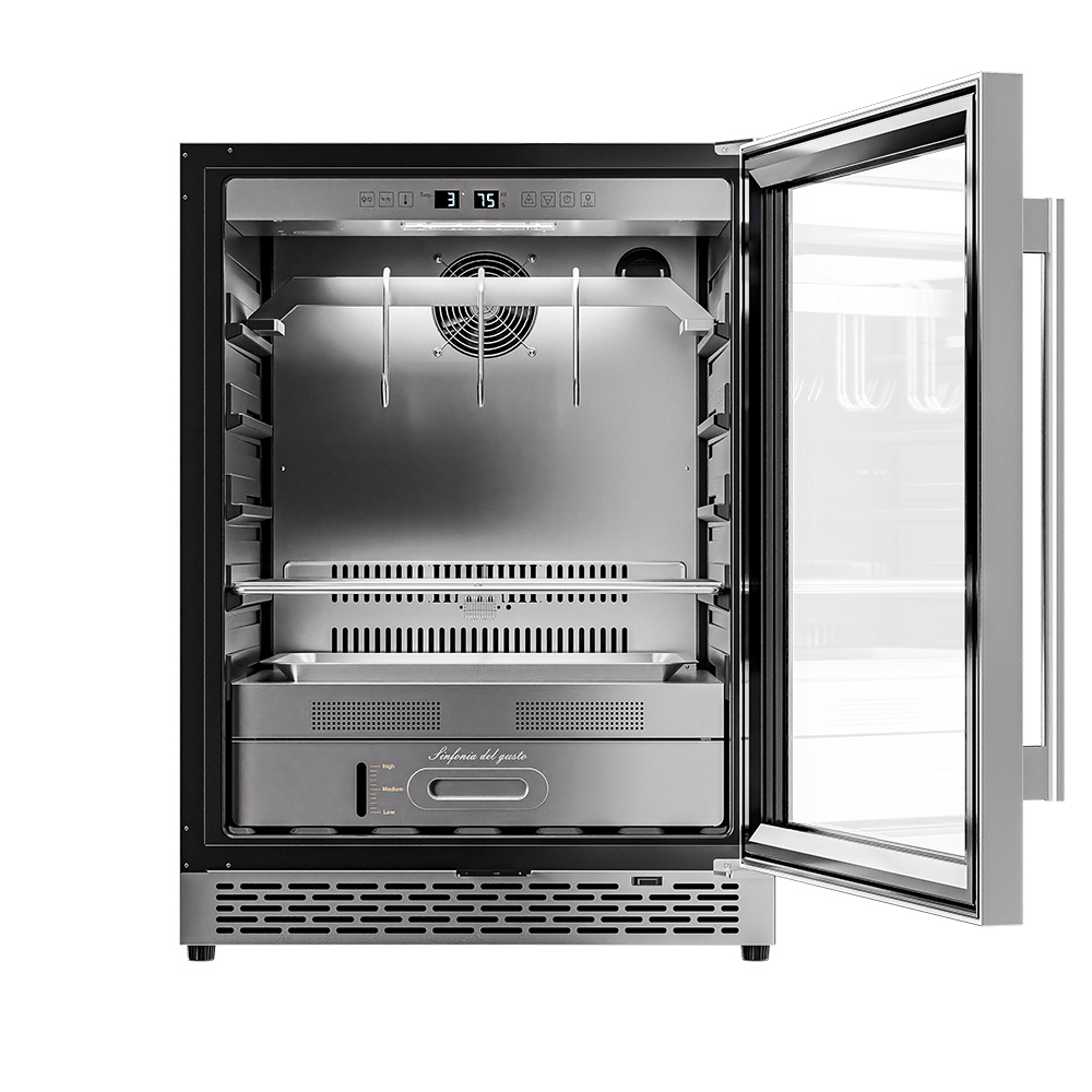 Внутреннее оснащение холодильника продумано до мелочей. Регулируемые ножки позволяют выровнять устройство, а встроенные крюки, поднос для соли и решетка из нержавеющей стали облегчают размещение и сушку содержимого. Резервуар для воды дает возможность контролировать уровень влажности в диапазоне от 60 до 85%, что важно для равномерного вызревания.