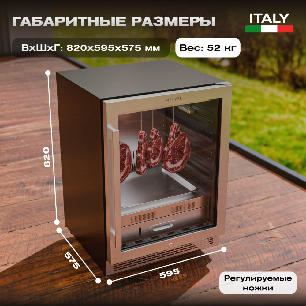 Встраиваемый холодильник для мяса Meyvel MM-45SR — это идеальное решение как для домашних, так и для коммерческих нужд. Встраиваемая модель объемом 110 литров вмещает до 45 кг мяса, обеспечивая оптимальные условия для его созревания.